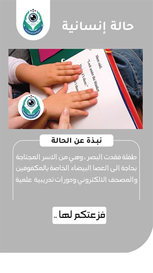 طفلة فقدت البصر ، وهي من الاسر المحتاجة ، بحاجة الى العصا البيضاء الخاصة بالمكفوفين والمصحف الالكتروني الخاص بالمكفوفين ودورات تدريبية علمية ، فزعتكم لها